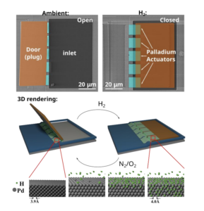 This system uses hydrogen gas as fuel and the α to β phase transformation of palladium hydride to drive microactuation. The microactuators, fabricated as 40 nanometer-thick palladium/titanium bimorphs, exhibit reversible changes of curvature of 0.7 inverse micrometers at room temperature, changes that are orders of magnitude superior to previous systems that utilize phase transformations to drive actuation. However, initial experiments in hydrogen and nitrogen show slow actuation response times at ~100s. To mediate this problem, we turned to density functional theory calculations and found that the addition of oxygen would lower energy barriers to the actuation, which we then confirmed experimentally and showed that the same actuators can respond an order of magnitude faster.
